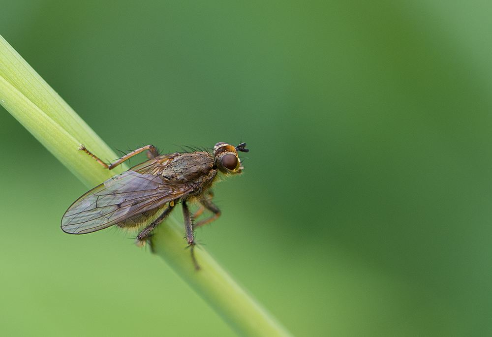 Die Dungfliege ist aus der Ordnung der Zweiflügler. Diese hier saß in Kalbach auf einem Grashalm.